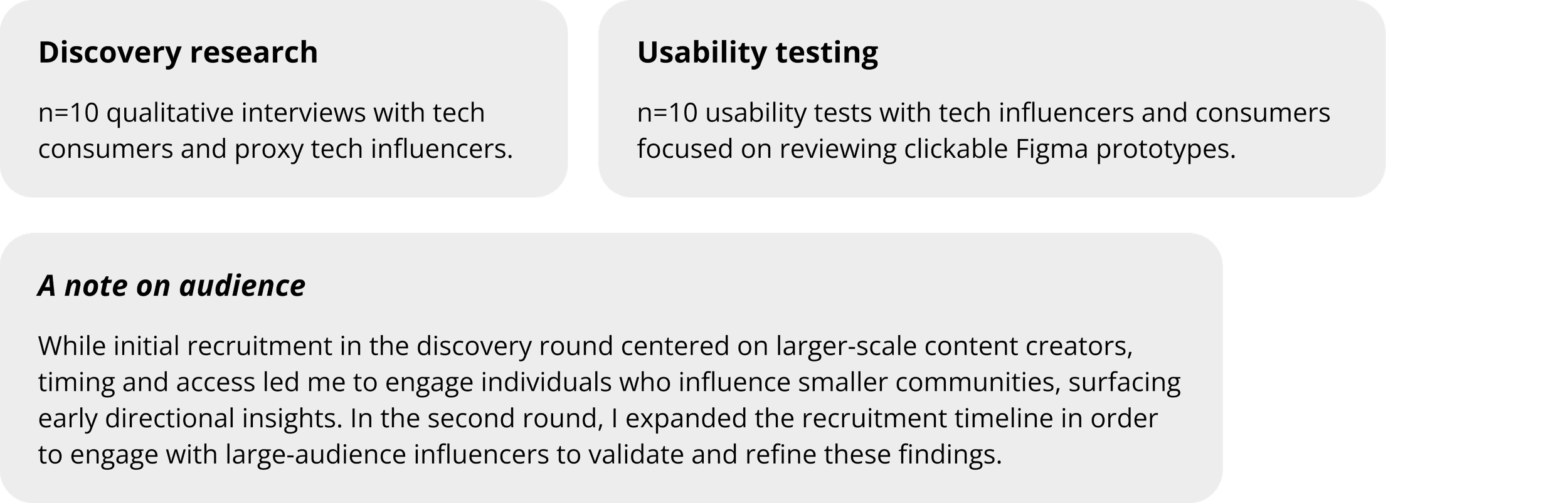 A key challenge was recruiting influencers with large public audiences in the discovery round. Pivoting to speak with “proxy influencers” - people with smaller but meaningful audiences, either within companies or on LinkedIn - allowed us to gather early insights that quickly informed design.
